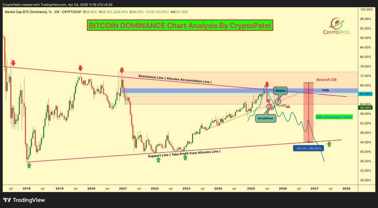نزدیکترین سطح ساختاری مهم در مسیر نزول، محدوده ۵۹ هزار و ۸۰۹ دلار (Break of Structure) است که به کف چرخه در ماه فوریه مربوط میشود و میتواند اولین حمایت جدی قبل از سناریوی سقوط عمیقتر باشد.
